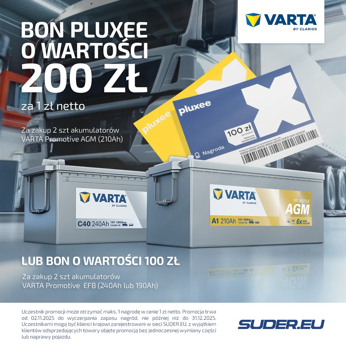 - Za zakup 2 akumulatorów AGM klient otrzymuje bon PLUXEE o wartości 200 zł za złotówkę.